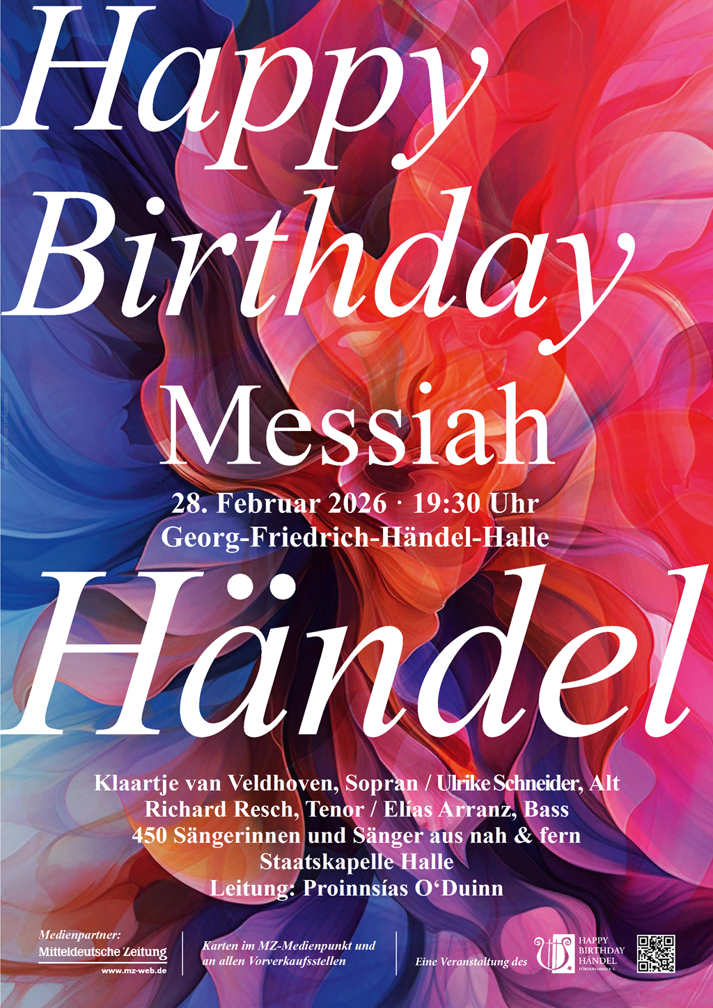 . Februar 2026 feiern wir den 341. Geburtstag von Georg Friedrich Händels, Halles großen Sohn mit einem prachtvollen „Happy Birthday Händel“. Wie schon seit mehr als 25 Jahren finden sich dafür rund 450 Chorsängerinnen und Chorsänger aus dem In- und Ausland zu einer festlichen Aufführung von Händels weltberühmten Oratorium „Messiah“ in der Händelhalle in Halle (Saale) zusammen. Konzertbeginn ist um 19:30 Uhr.